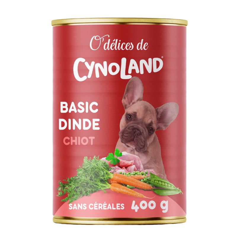 BASIC Dinde Chiots O’Délices de Cynoland est un aliment humide complet spécialement conçu pour couvrir les besoins nutritionnels élevés des chiots en pleine croissance, en leur offrant une alimentation équilibrée, digeste et hautement appétente.