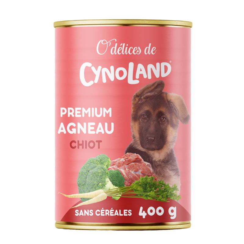 PREMIUM Agneau Chiots O’Délices de Cynoland est un aliment humide complet conçu pour couvrir les besoins nutritionnels élevés des chiots en pleine croissance, offrant une alimentation équilibrée, digeste et très appétente.
