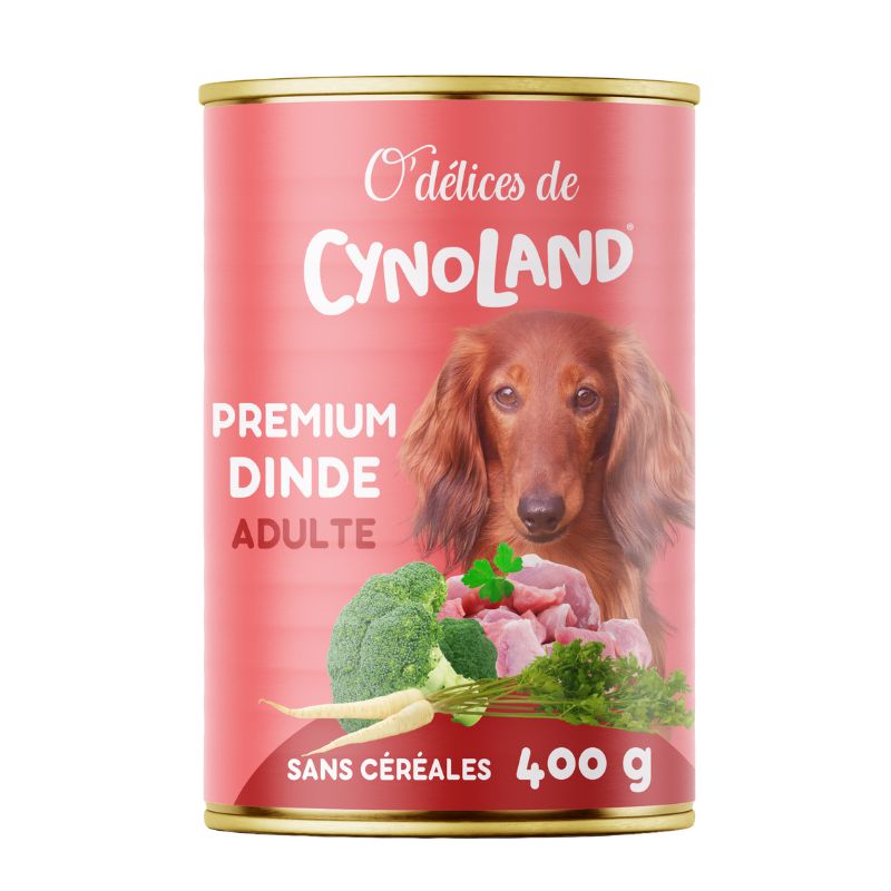 PREMIUM Dinde Chiens Adultes O’Délices de Cynoland est un aliment humide complet formulé pour répondre aux besoins nutritionnels quotidiens des chiens adultes, en proposant une recette riche en viande de qualité et en légumes soigneusement sélectionnés.
